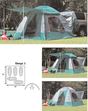Unique design allows tent to standalone of attach easily to the back of most sport utility vehicles for additional sleeping space. Three-pole pin and ring frame system with shock-corded fiberglass poles. "No-see-um" mesh "T" style front door and rear portal with zippered storm flaps. Two "No-see-um" mesh side windows with zippered storm flaps. Durable speed clips secure frame to tent. Complete with stakes, carry/storage bag and instructions. Flame retardant, meets C.P.A.I.-84 specifications.FALSE.